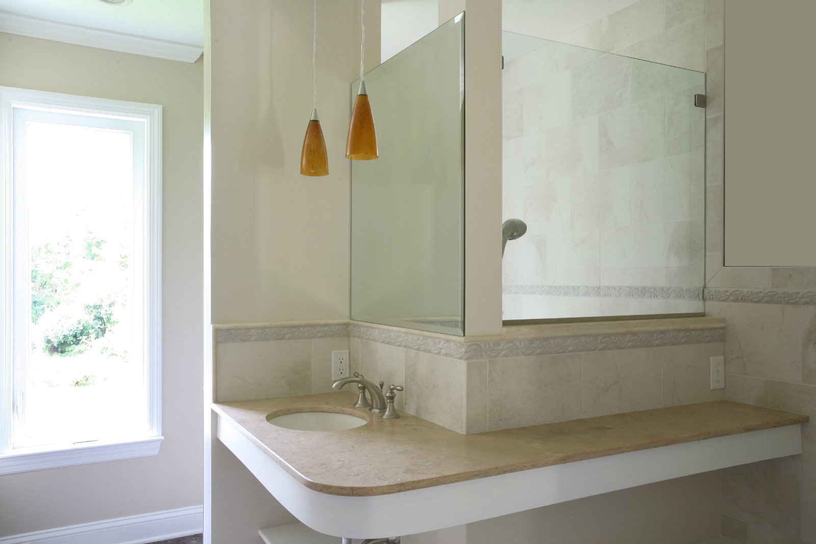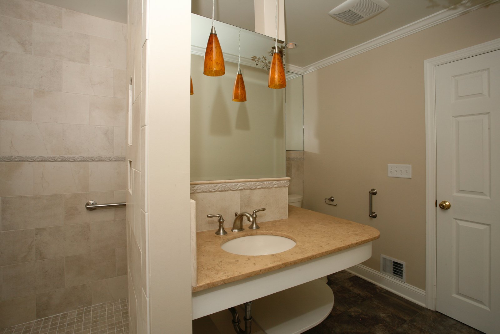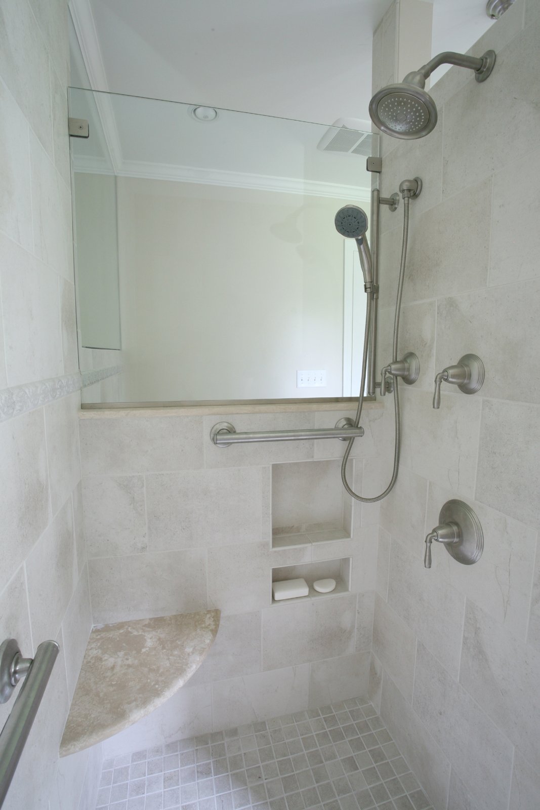Barrier free bathroom, walk in shower with travertine seat and grab bars, noble wall niches, travertine countertop with open storage, glass spray panel, large window, ceramic tile in the shower and on sink bask splash, comfort height toilet, pocket door to in-law bedroom