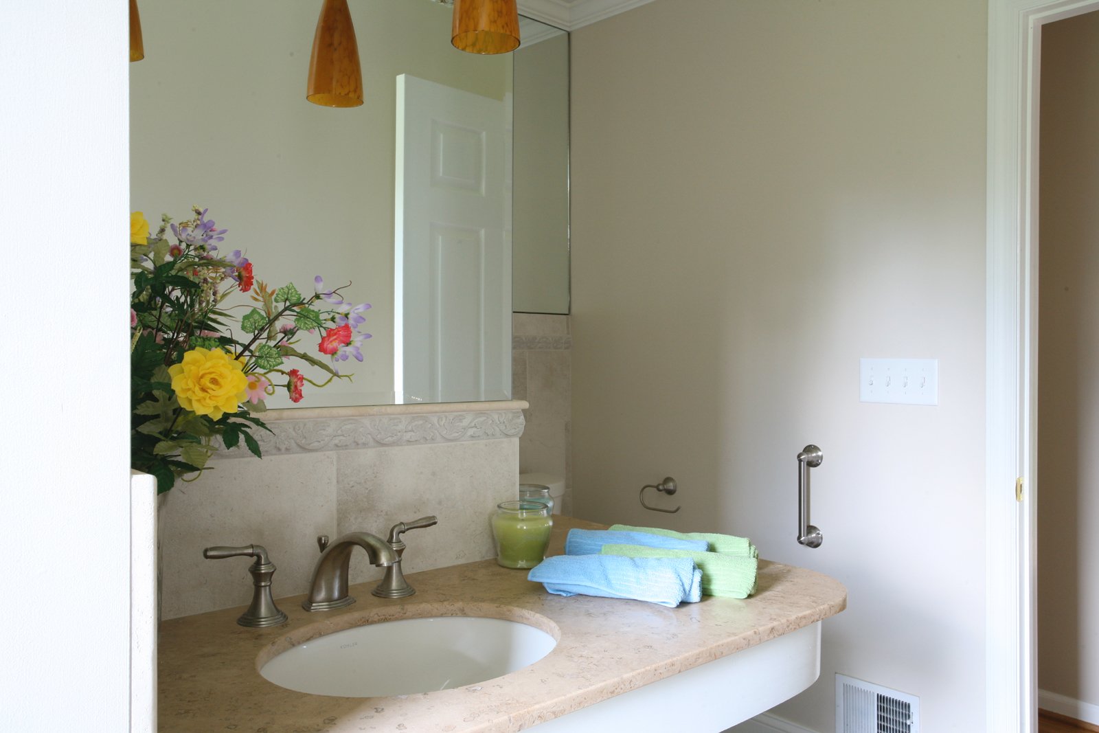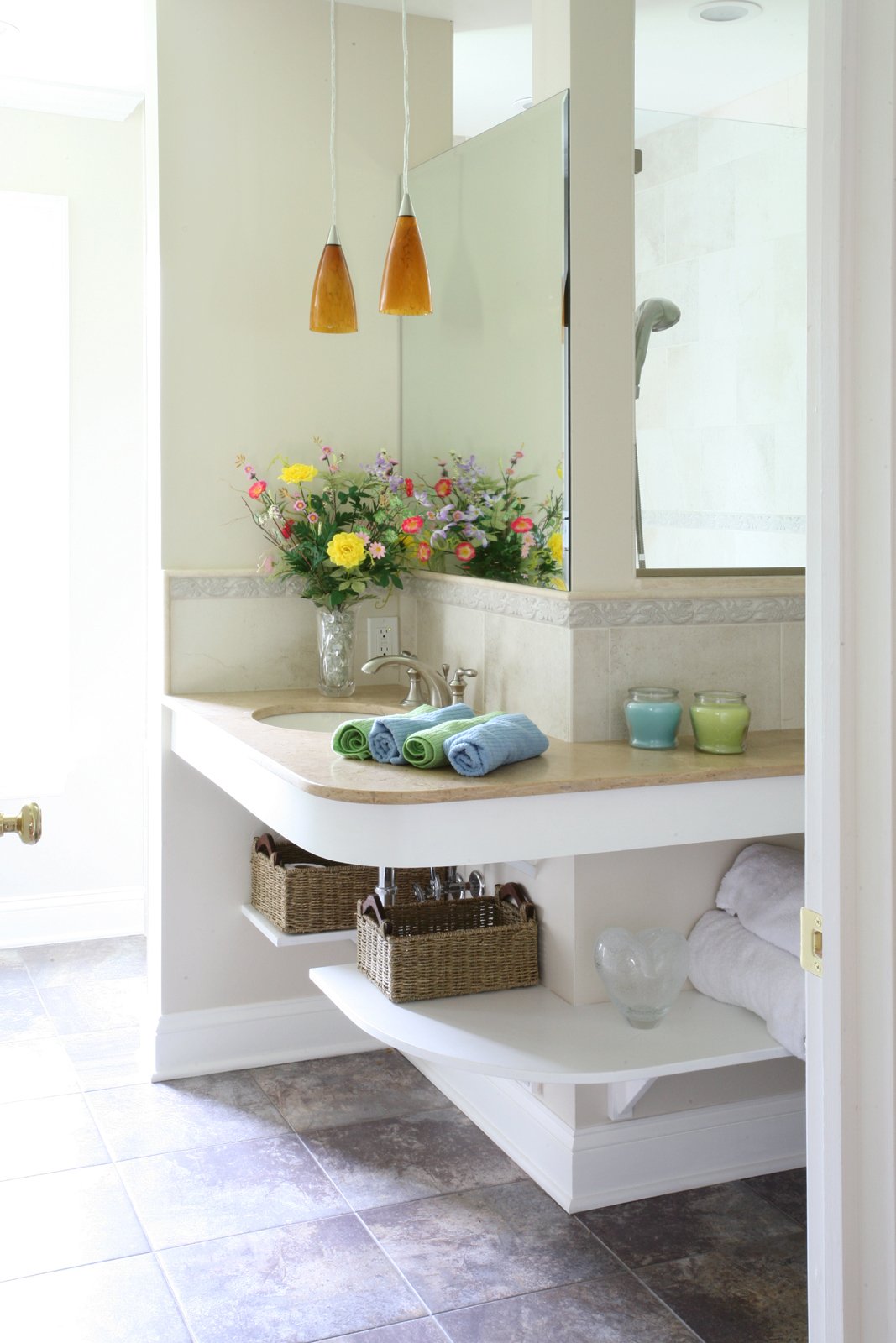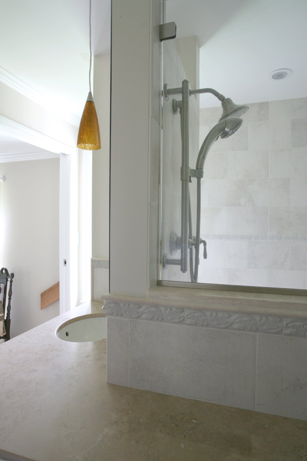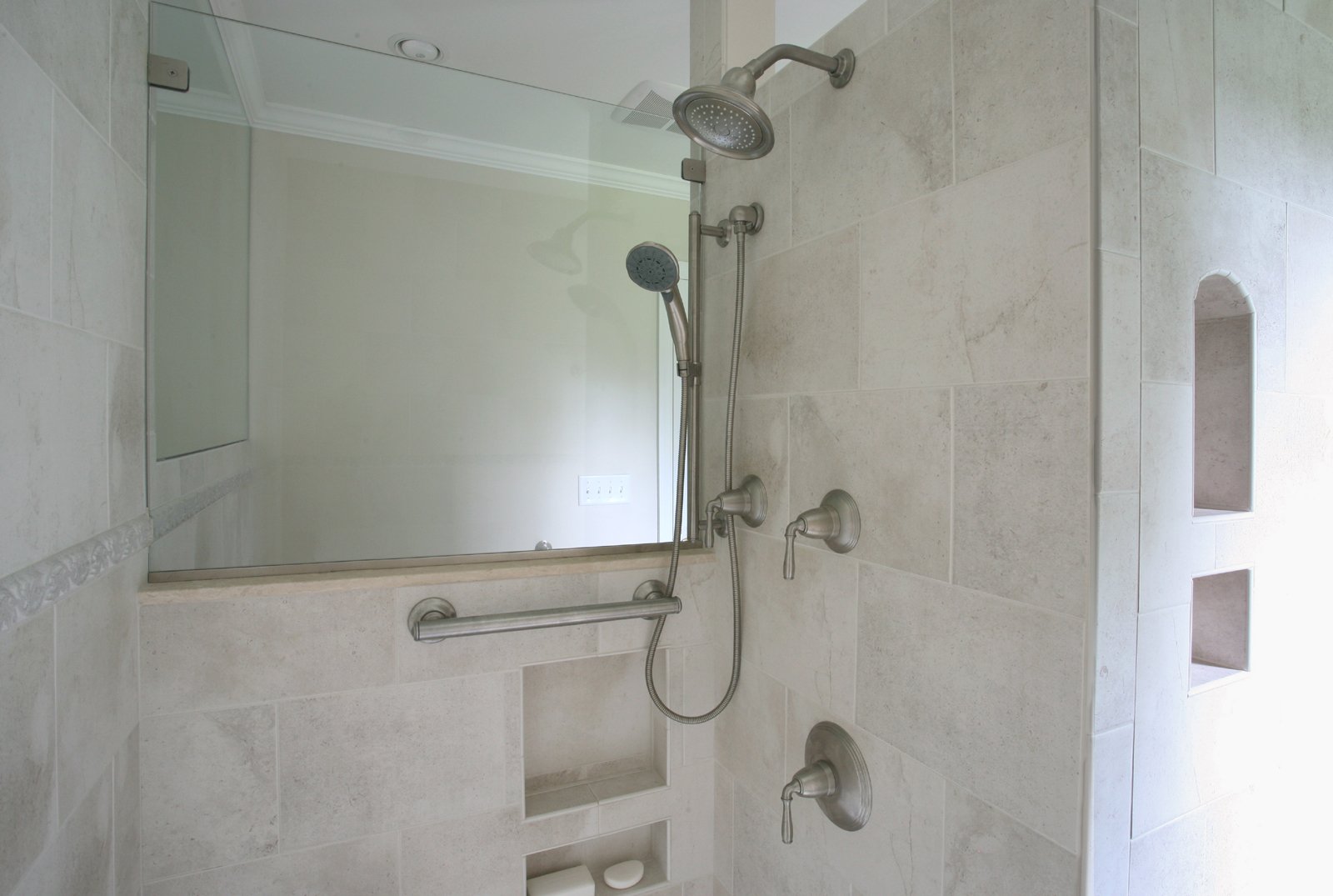 Barrier free bathroom, walk in shower with travertine seat and grab bars, noble wall niches, travertine countertop with open storage, glass spray panel, large window, ceramic tile in the shower and on sink bask splash, comfort height toilet, pocket door to in-law bedroom