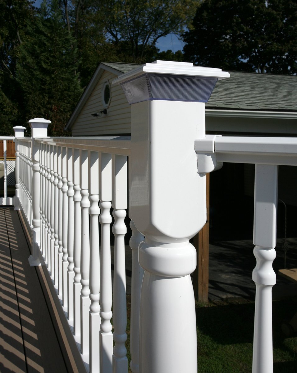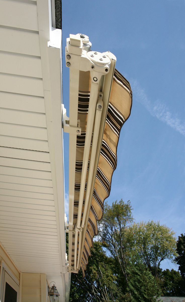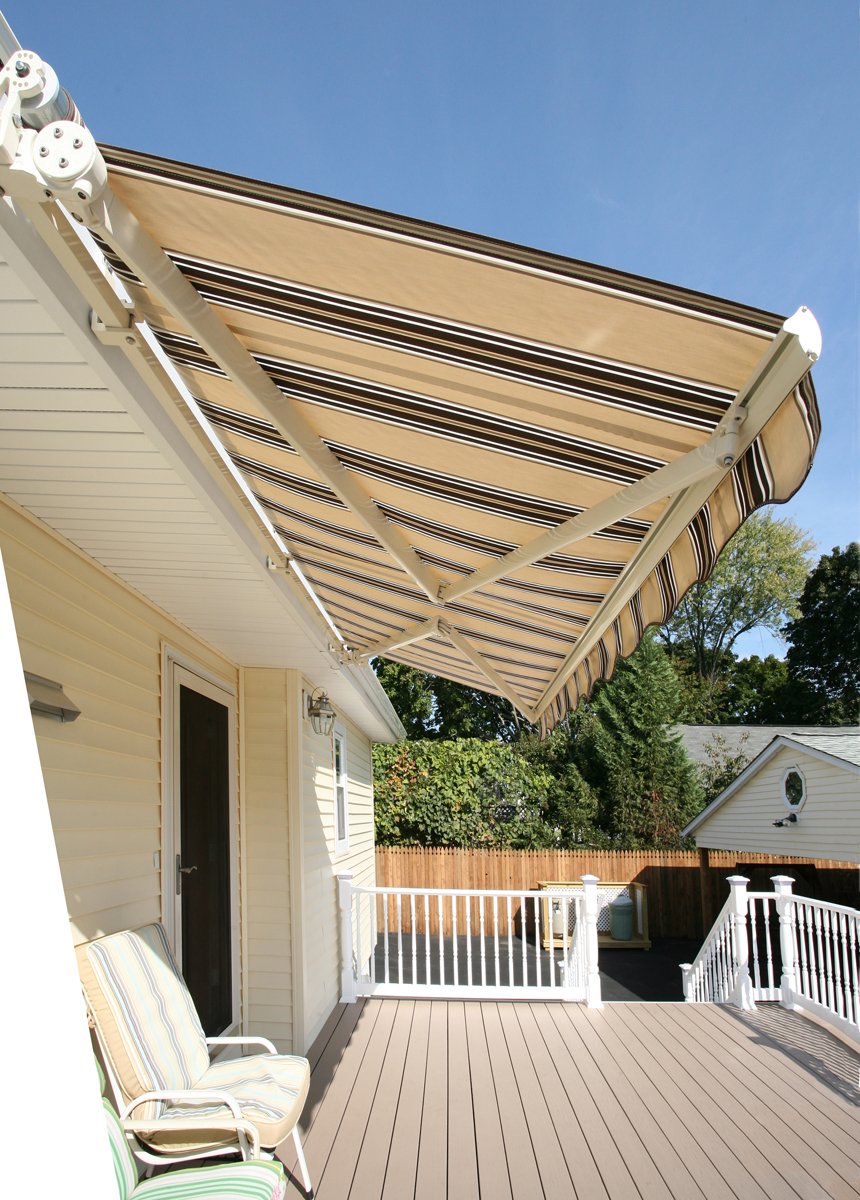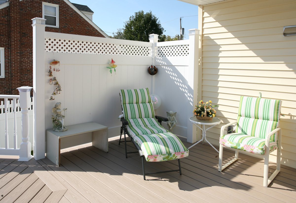 We created this deck using Azek materials, solar light caps and a privacy panel. We also added a Sunsetter remote controlled retractable awning for those sunny days.