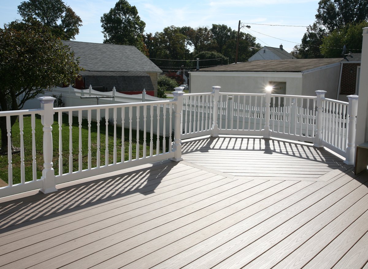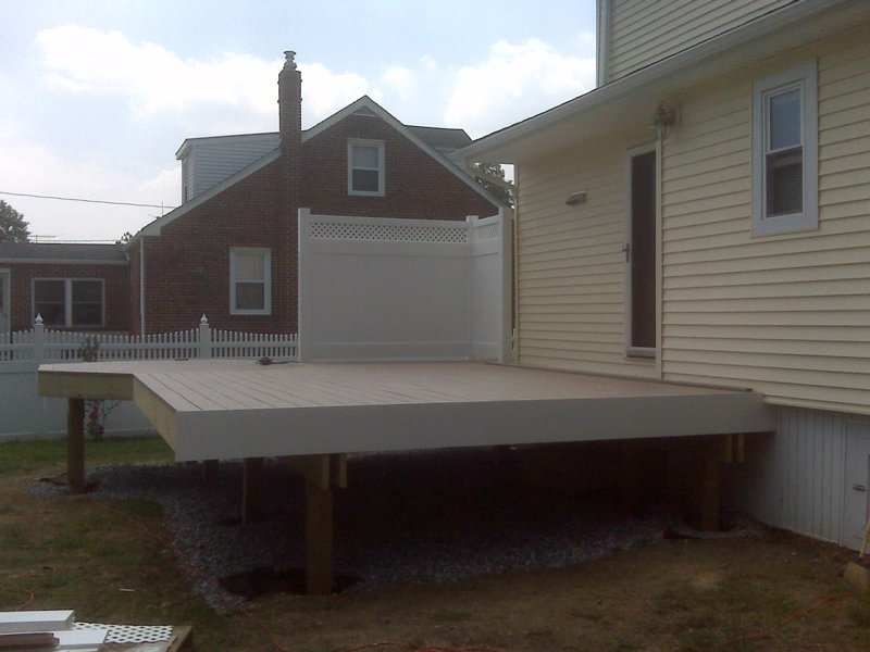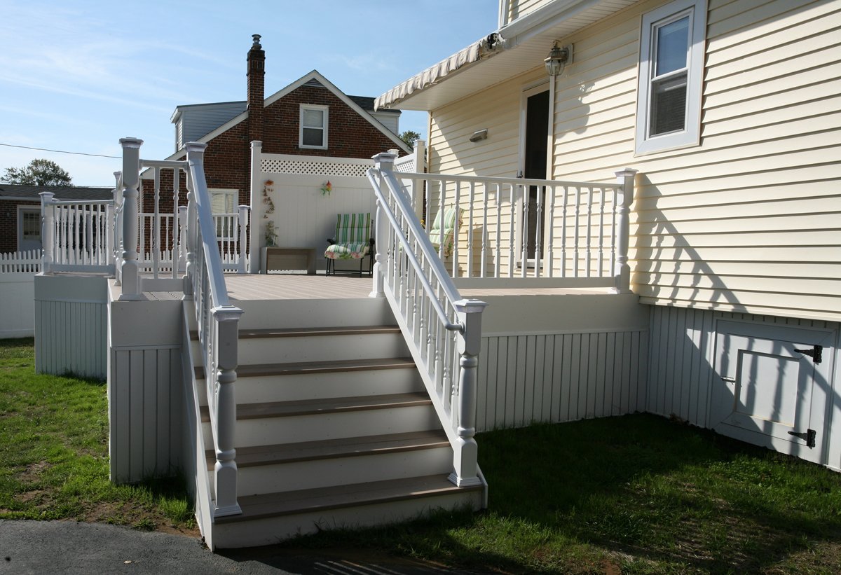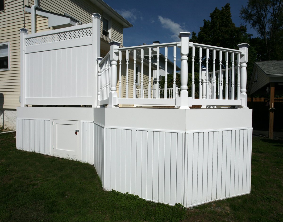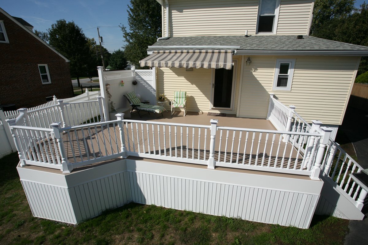 We built this deck from the Homeowners design. They wanted a maintenance free deck that featured outdoor living space with a privacy nook. This deck features solar light caps, vinyl posts and railing, Azek decking, a privacy area, octagon for more seating and a remote controlled Sunsetter retractable awning for those sunny days.