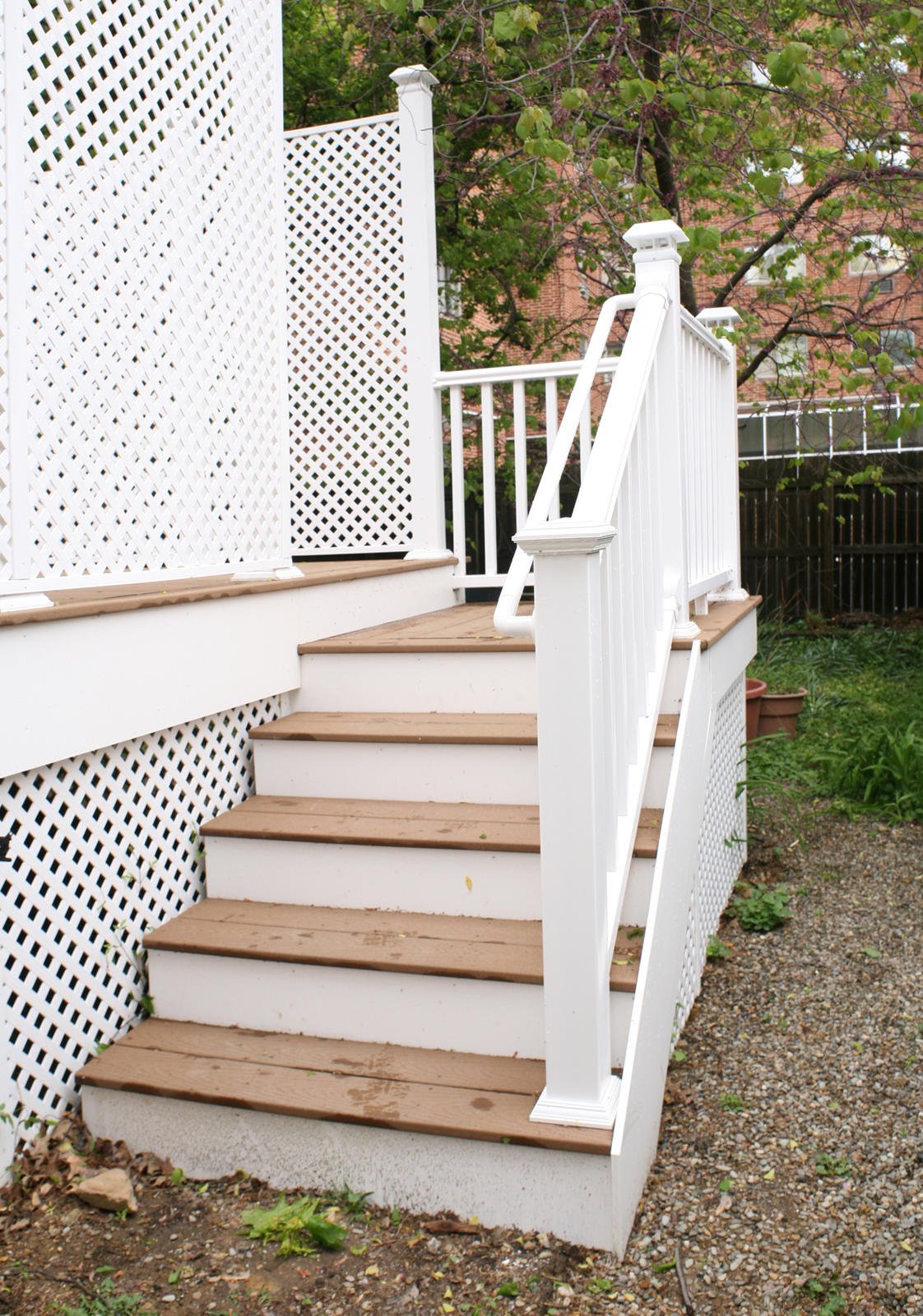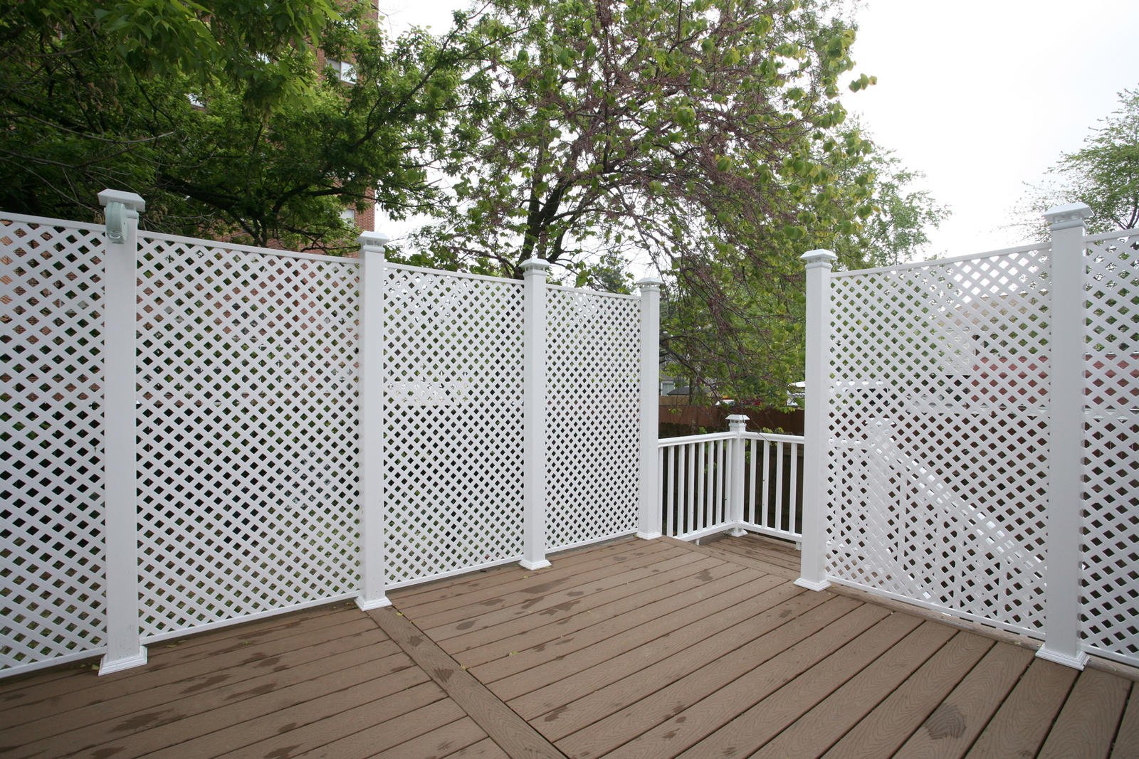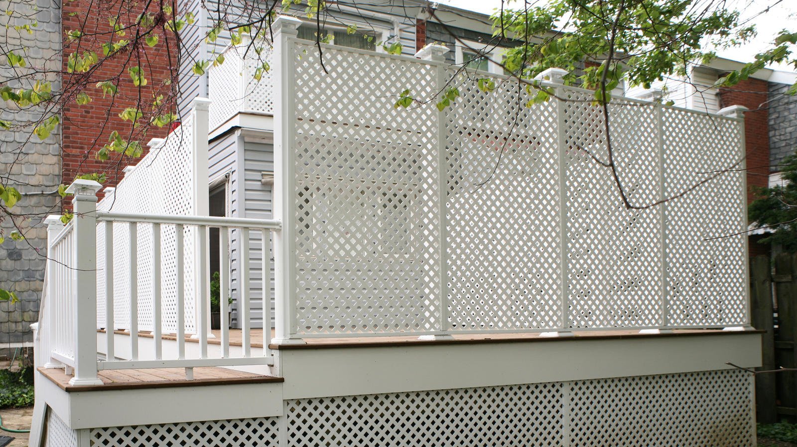 We created an urban retreat for the homeowner. The materials used were Trex decking, composite privacy panels and posts with solar light caps. Take a look above at the second story private balcony made of the same materials.