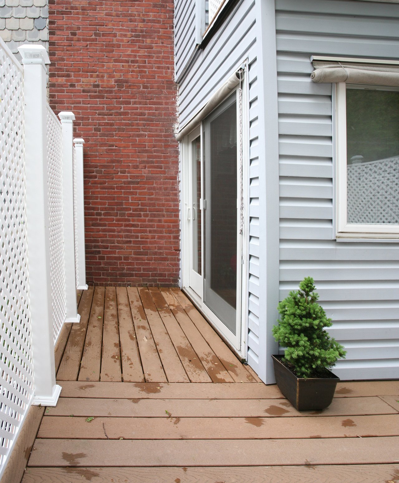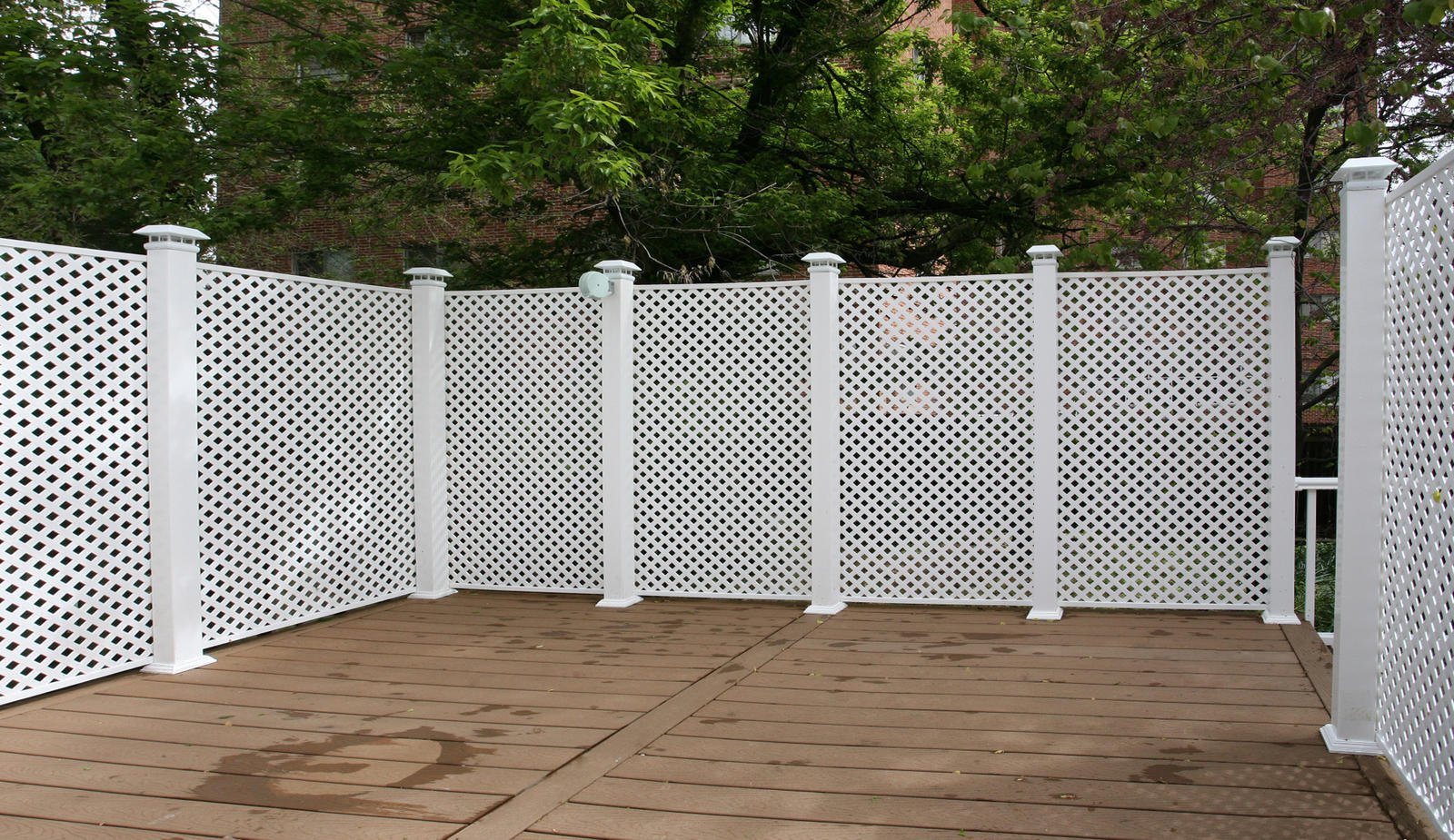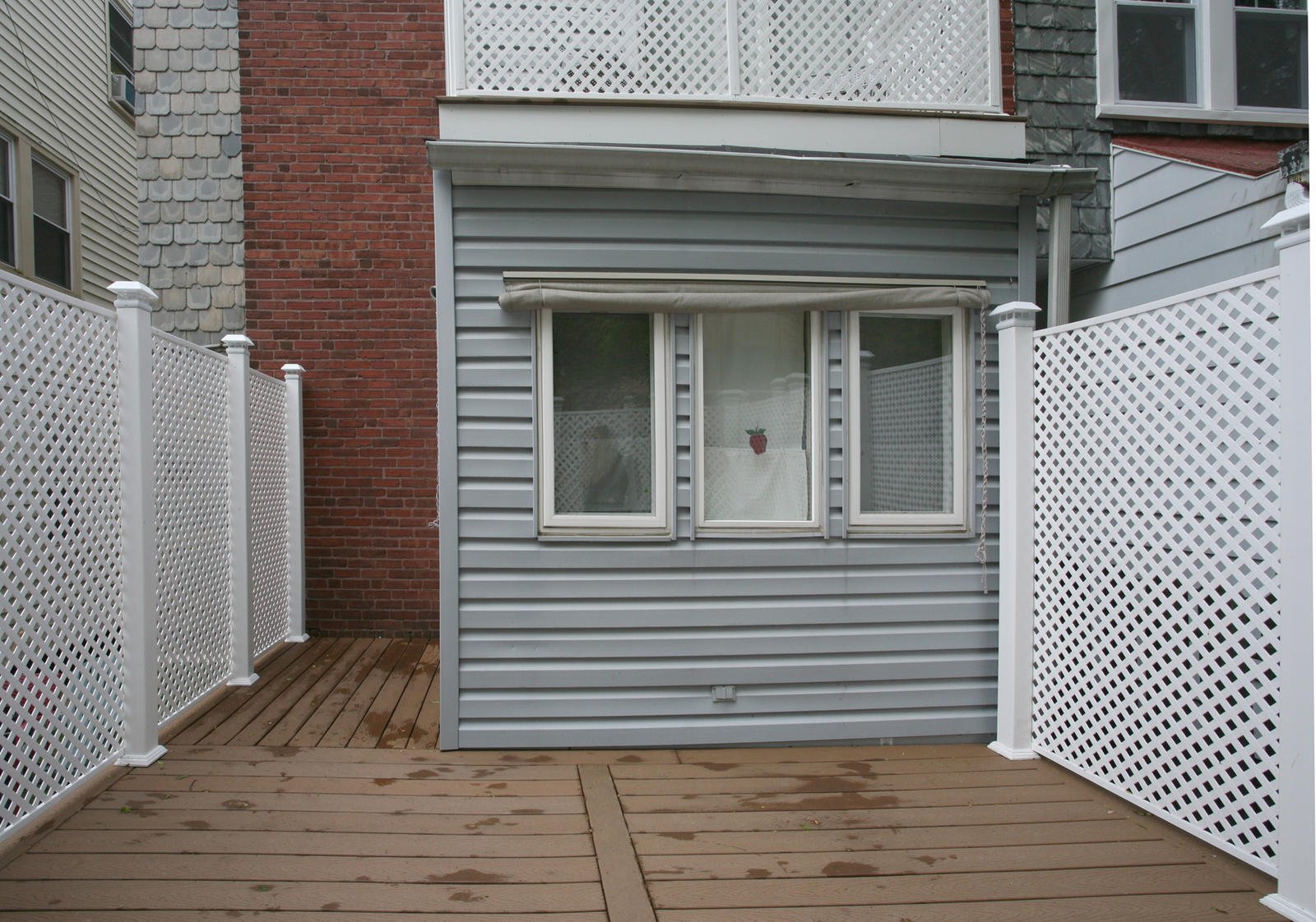 We created an urban retreat for the homeowner. The materials used were Trex decking, composite privacy panels and posts with solar light caps. Take a look above at the second story private balcony made of the same materials.